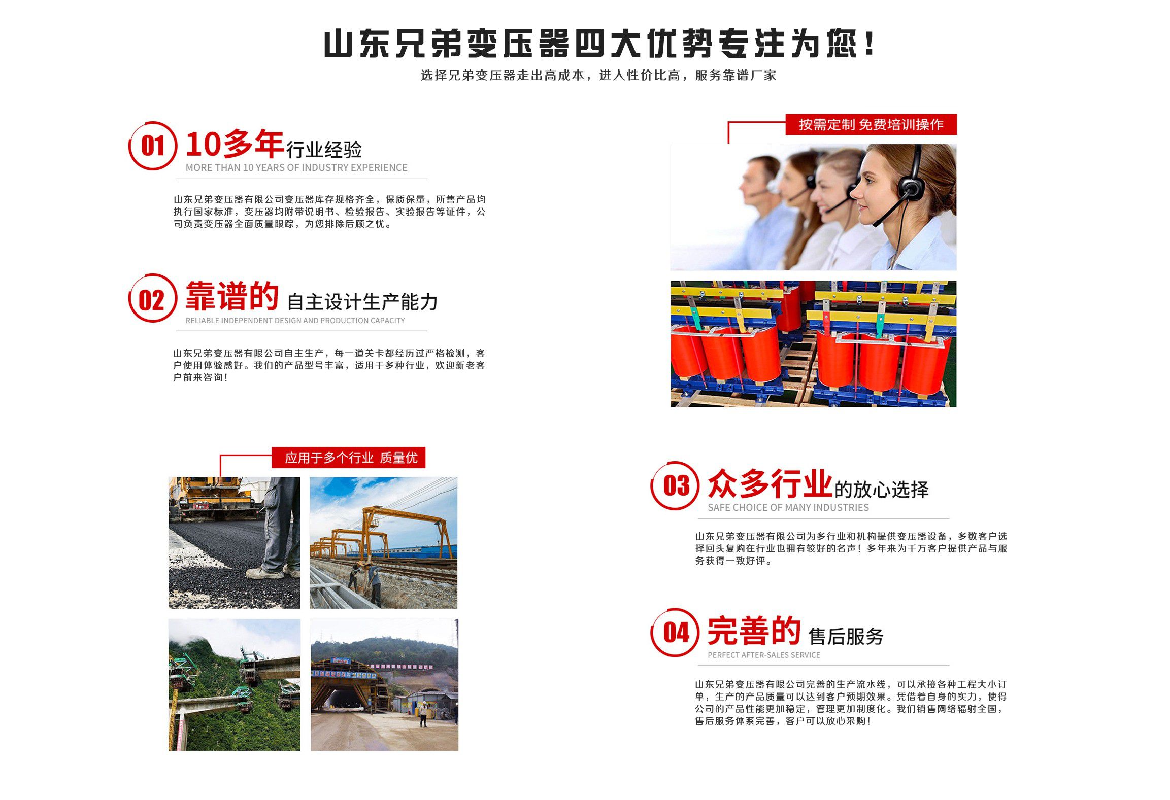山東兄弟變壓器有限公司經營SCB10干式變壓器,SCB11干式變壓器價格,SCB12變壓器,SCB13干式變壓器,SCB14干式變壓器,SCB18干式變壓器等產品及用戶要求的特殊變壓器?! 」镜馁|量方針是:“顧客的滿意,是我公司的追求?!眻猿仲|量,用戶至上,以質興業,以優取勝,愿為廣大用戶設計各種要求的變壓器,以求共同發展。 企業精神:“創新、求實、誠信、高效”。 企業作風:“嚴、細、實、快”。 企業工作方針:“加強內部管理,夯實基礎,全面提高職工整體素質,使企業管理水平再上新的臺階”?! 」?..